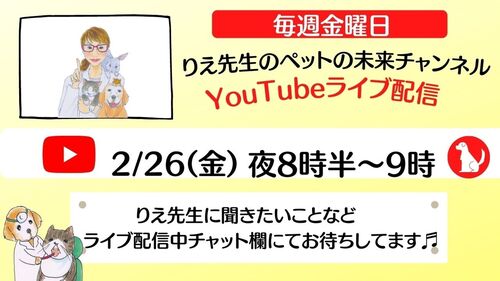明日2/5(金)は毎週金曜恒例YouTubeライブの日です! 夜8時~9時、りえ先生のペットの未来チャンネルから配信します(^^)/ ライブ中、チャット欄にて皆様からのコメントや質問も沢山募集しております!♪ 皆様ぜひご覧ください(^^♪ YouTubeライブ